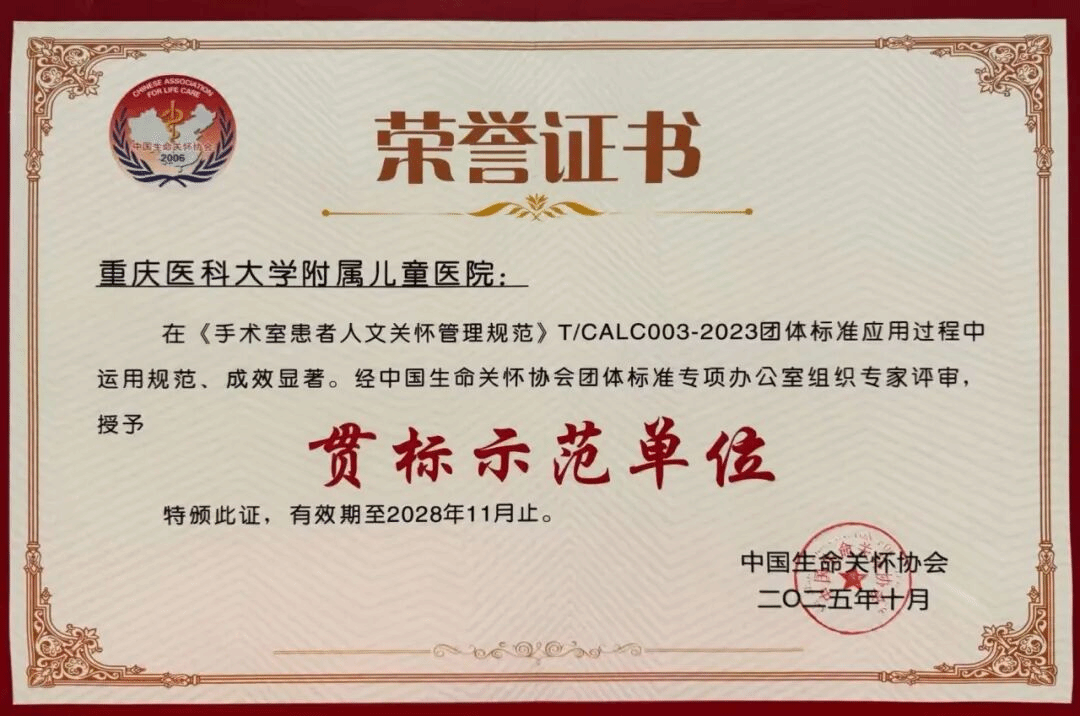 10月31日,重医附属儿童医院正式获评全国首批《手术室患者人文关怀管理规范》团体标准贯标示范单位。这项由中国生命关怀协会颁发的证书,不仅是对医院卓越管理的肯定,更标志着在儿童医疗领域成功实现从“技术导向”到“人文引领”的跨越式发展,在全国儿童专科医院中树立了人文关怀的新标杆。