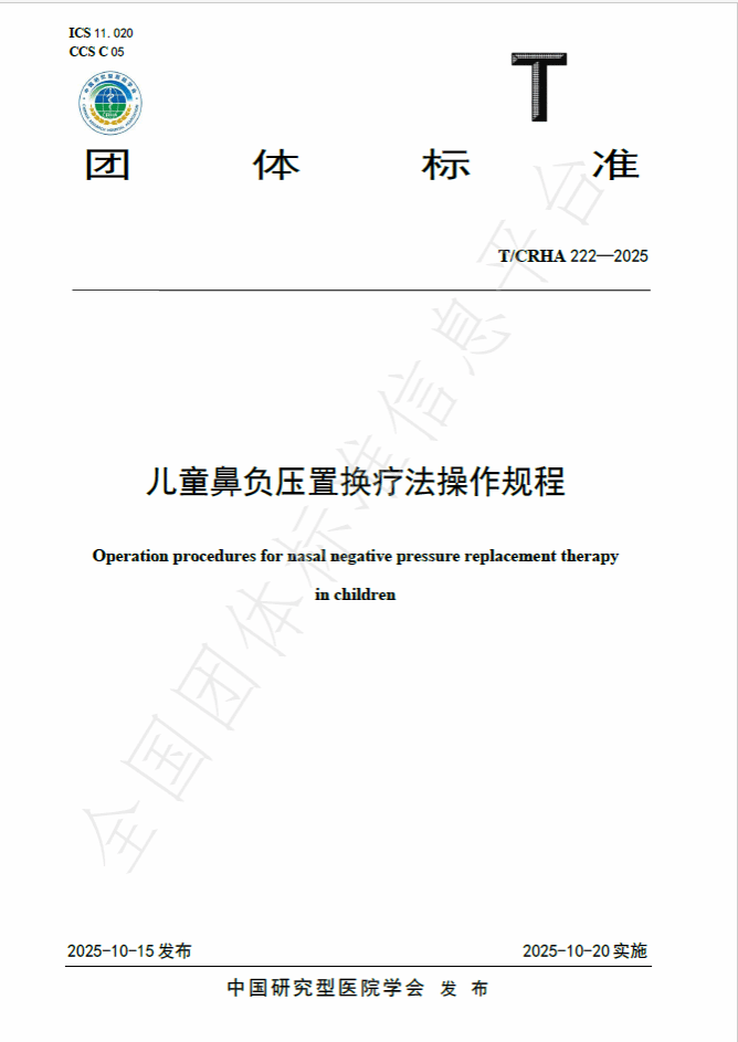 在此背景下,由重庆医科大学附属儿童医院牵头,联合重医附属第二医院、成都市妇女儿童中心医院、广州市妇女儿童医疗中心柳州医院、重庆市永川区第一人民医院、重庆佑佑宝贝妇儿医院、重庆市沙坪坝区陈家桥医院、重庆合川宏仁医院等多家权威机构,制定的《儿童鼻负压置换疗法操作规程》团体标准(T-CRHA 222-2025),于2025年10月15日正式发布,10月20日正式实施,为儿童鼻负压置换疗法规范化提供科学依据。