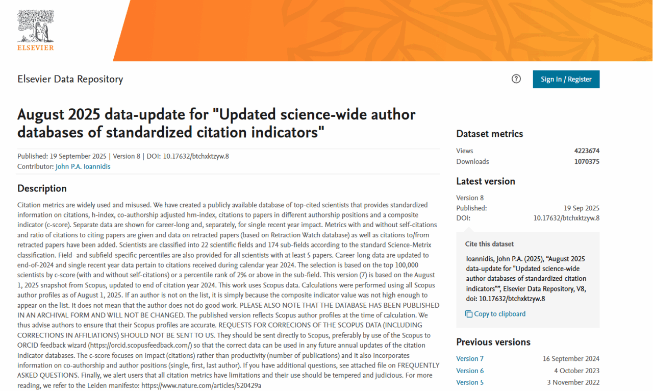 “全球前2%顶尖科学家榜单”具有较高的透明度和权威性,旨在客观真实地评价科学家的科研成绩和科学影响力。该榜单通过论文引用数、h因子、合著者修正的hm因子、单独或第一作者的文章引用数等指标综合评估科学家的科研影响力,从全球近700万名科学家中遴选出世界排名前2%的科学家,涵盖22个学科领域和174个子领域。其中,“终身影响力”榜单统计科学家职业生涯期间的综合表现,“年度影响力”榜单则聚焦上一年度的学术影响力。