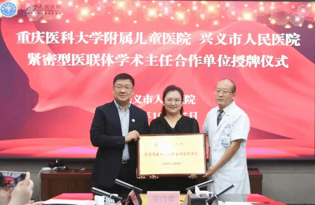 医院党委委员、副院长王佚与兴义市人民医院副院长陈春签署《重庆医科大学附属儿童医院与兴义市人民医院医联体学术主任合作协议》,并与兴义市人民医院党委书记王忠安进行“紧密型医联体学术主任合作单位”牌匾的授接。