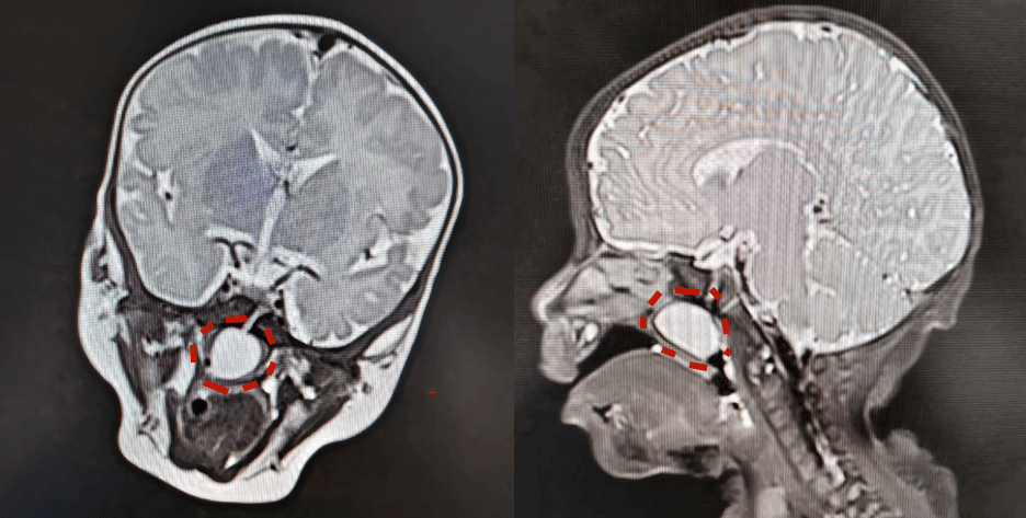 病灶位置特殊,毗邻颅底蝶骨斜坡,该区域是颅骨底部的一个关键区域,相当于头部深层的 “交通枢纽”——上方是大脑组织,下方直接连接鼻咽部,两侧还邻近控制面部感觉、运动的神经,以及供应脑部的血管,手术操作容错率极低。
