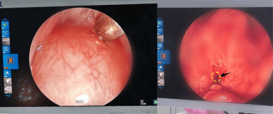间隔2周,杨大志副主任医师再行“鼻内镜下鼻腔探查术”,顺利取出填塞碘仿纱条,确认带蒂粘膜瓣生长良好,无脑脊液漏复发。