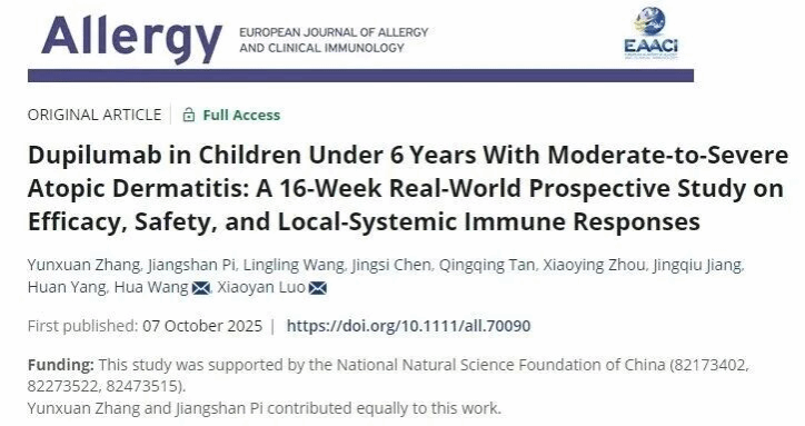 10月7日,重庆医科大学附属儿童医院罗晓燕教授团队在Allergy (IF: 12, Q1/1区Top)发表题为 “Dupilumab in Children under 6 Years with Moderate-to-Severe Atopic Dermatitis: A 16-Week Real-World Prospective Study on Efficacy, Safety, and Local-Systemic Immune Responses” 的前瞻性研究。