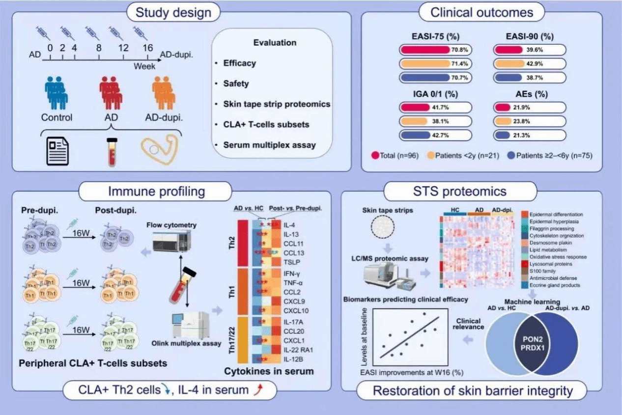 该研究系统评估了Dupilumab对6月~5岁中重度AD的疗效与安全性,并首次结合皮肤、血清炎症因子蛋白组与皮肤归巢T细胞亚群分析,深入揭示其免疫调节与屏障修复的双重作用机制。