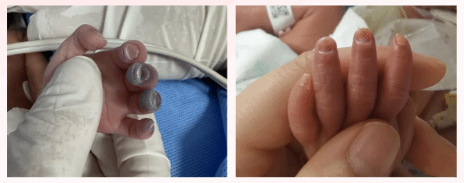新生儿科护理团队第一时间集结,迅速启动多学科协作,邀请烧伤整形科、护理伤口造口会诊,结合最新诊疗指南,凭借丰富的临床经验,制定出精细化护理方案;借助彩超,实时监测手指血流;每班拍照,严格记录进展;24小时监测肢端循环以防动脉栓塞。