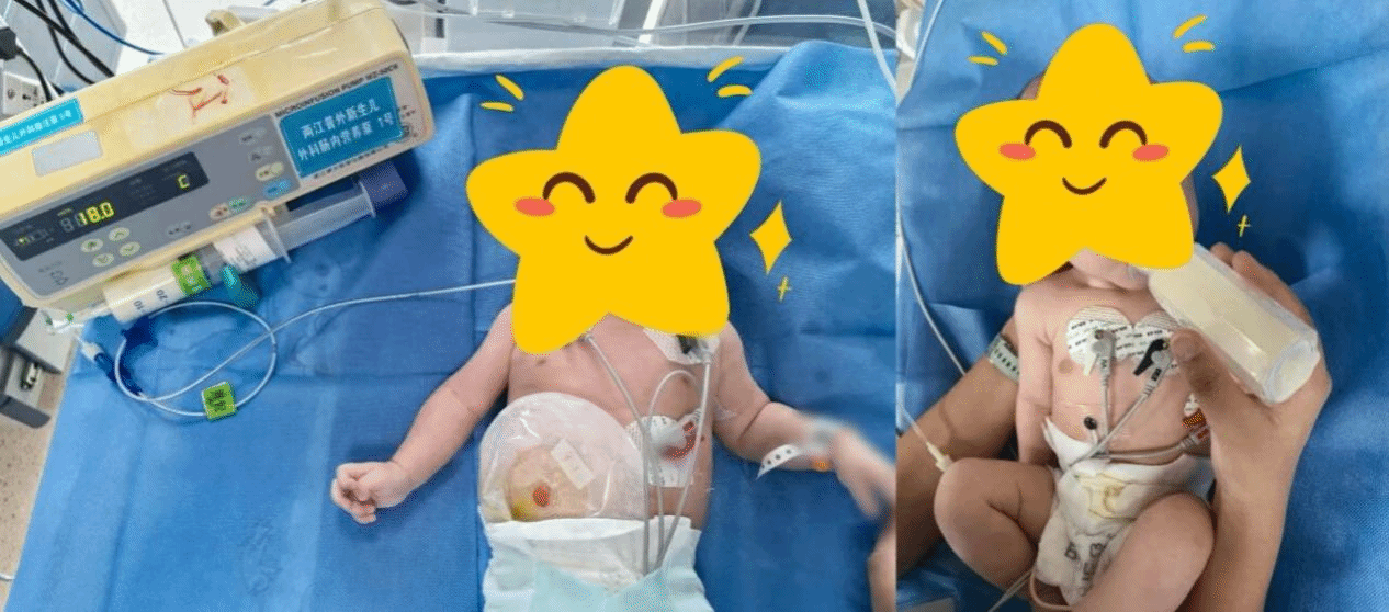 2025年4月30日,胎龄仅31+2周、产重1490克的双胎早产宝宝乐乐(化名)剖宫产后于外院抗感染、CPAP(持续正压通气)辅助通气等处理。生后11天突发腹胀,确诊坏死性小肠结肠炎(NEC),外院连夜手术切除40厘米坏死肠管。