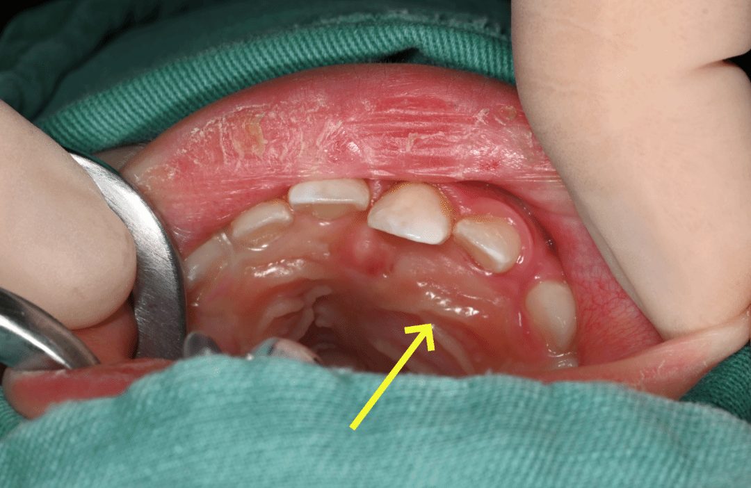 术前小蜻蜓口内照片 黄色箭头指向瘤体