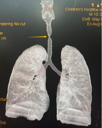 “正常儿童这个年龄段的气管应该有10-12mm左右。孩子的通气功能受到严重影响,同时还影响到他的生长发育,须尽快手术干预。” 耿刚副主任解释道。