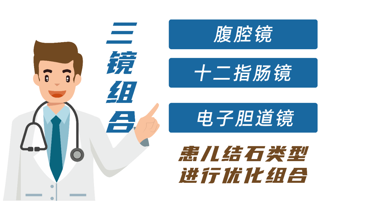 “三镜”有多种方式联合,如,十二指肠镜+腹腔镜、腹腔镜+胆道镜、腹腔镜+胆道镜+十二指肠镜,根据患儿结石的类型进行优化组合,最大化实现患儿快速康复。