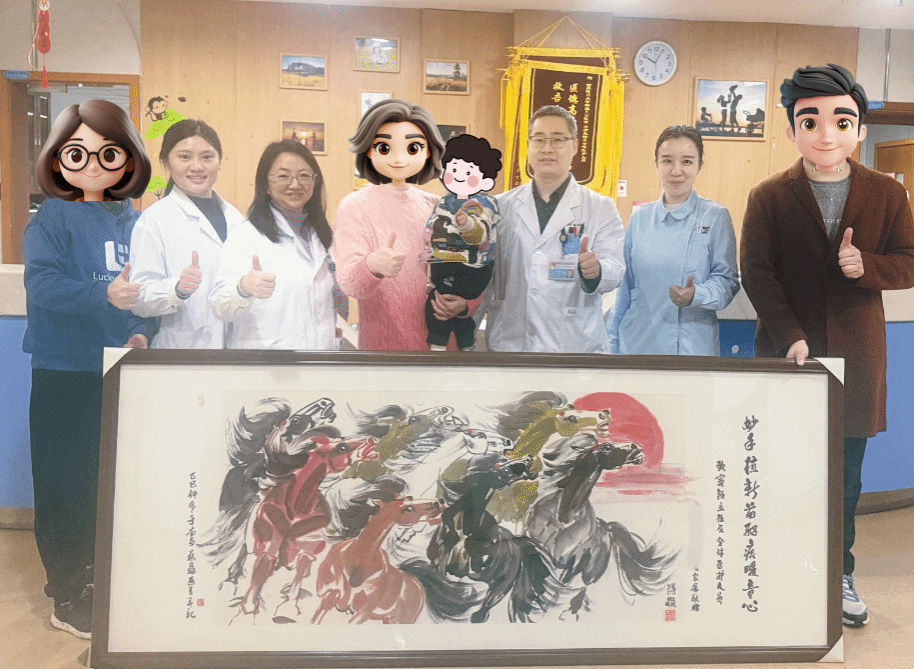 为表达对医护团队的谢意,小宇的爷爷挥毫绘就一幅《骏马奔腾图》,并题字“妙手植新苗,驱疾暖童心”,以此寓意孩子的生命如新苗重焕生机,也赞颂医护团队如骏马奋进、不负使命的专业与温度。