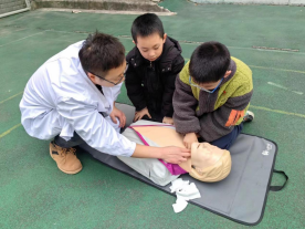 其次,为使学生更深入的了解海姆立克急救法和心肺复苏的要领,医护人员分为10个组手把手为同学讲解手法和注意事项,力求做到施救动作规范、到位。在医护人员和老师的鼓励下,同学们踊跃上台,积极参与模拟“我是小医生”急救练习,孩子们做得有模有样,得到了医护人员的肯定。