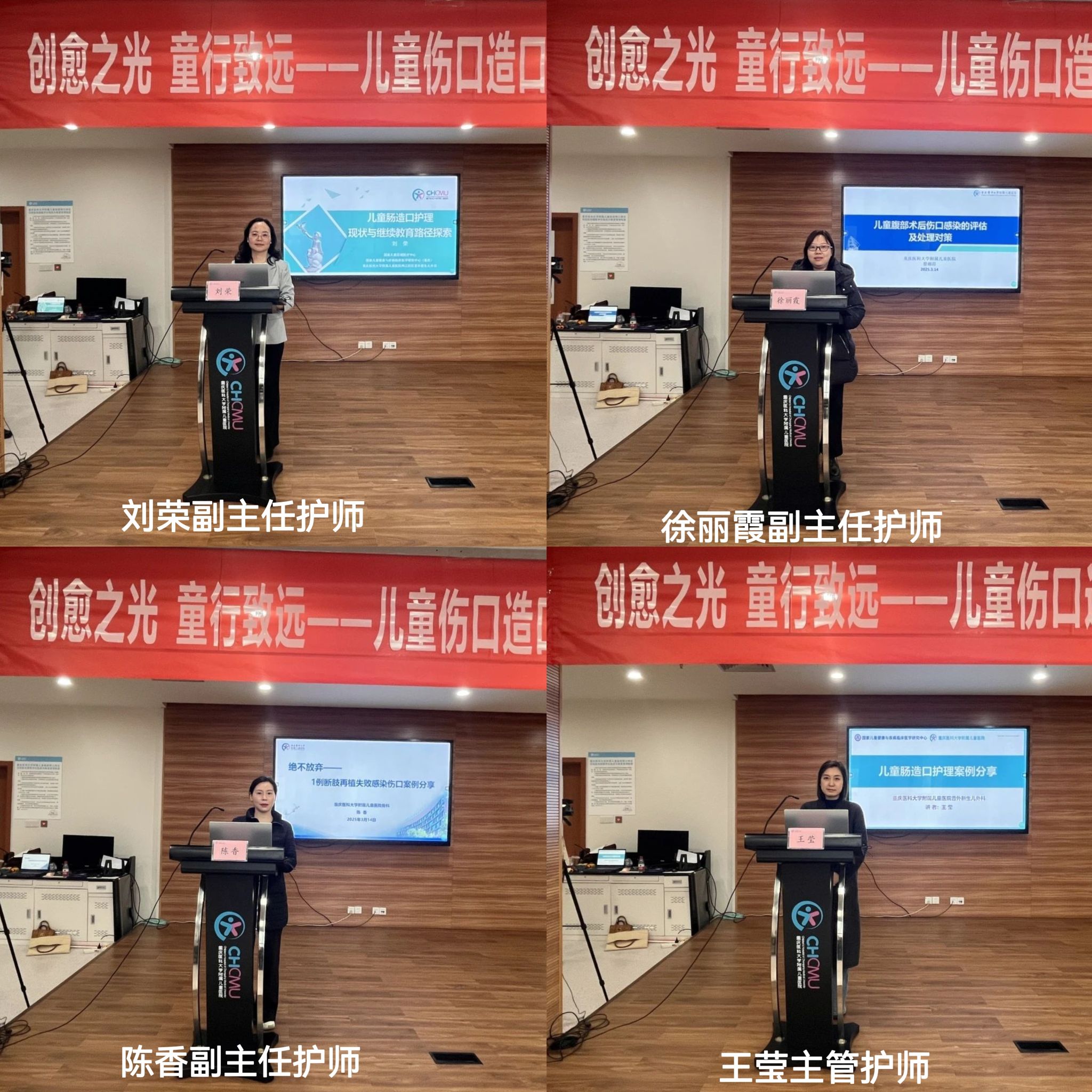 随后,刘荣副主任护师、徐丽霞副主任护师、陈香副主任护师和王莹主管护师分别从不同角度分享了儿童肠造口护理的实践经验。