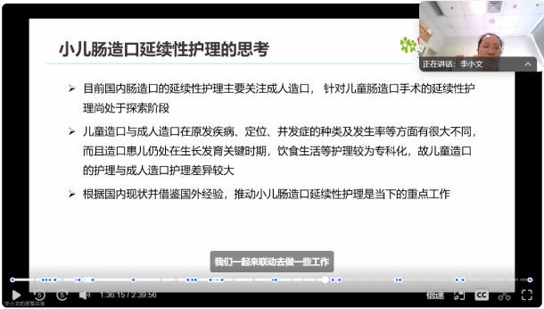 四川大学华西二院李小文副主任护师以“小儿肠造口延续性护理的思考与实践”为主题,线上分享了华西二院新生儿科在造口延续护理中的宝贵经验。剖析了当前儿童伤口造口护理面临的挑战,强调了提升护理水平的紧迫性,并指出人才培养是提升护理质量的关键。