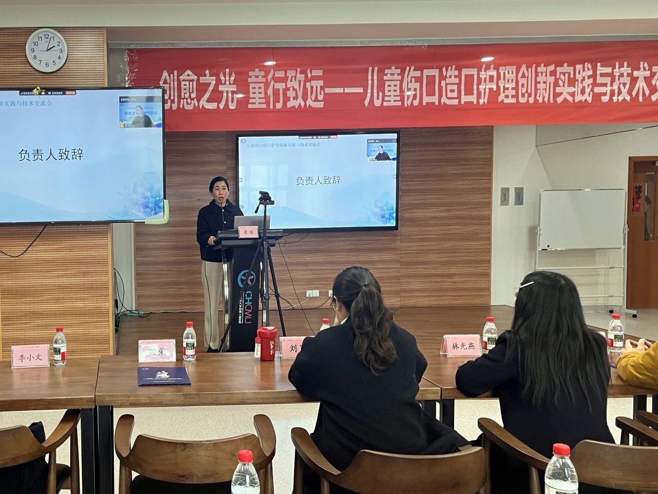 会议伊始,护理部副主任崔璀主任护师为本次交流会致辞。她充分肯定了我院造口伤口专科护士在过去十余年中的突出贡献,特别是在院内MDT多学科护理会诊中累计参与2万余人次,重点攻克了儿童肿瘤、免疫缺陷相关伤口以及危急重症新生儿造口及其并发症的护理难题,显著改善了患者的预后和转归。她强调,儿童伤口造口护理创新实践的重要性不容忽视,期望通过此次交流会,进一步推动该领域的交流与进步,碰撞出智慧的火花,取得更加丰硕的成果。