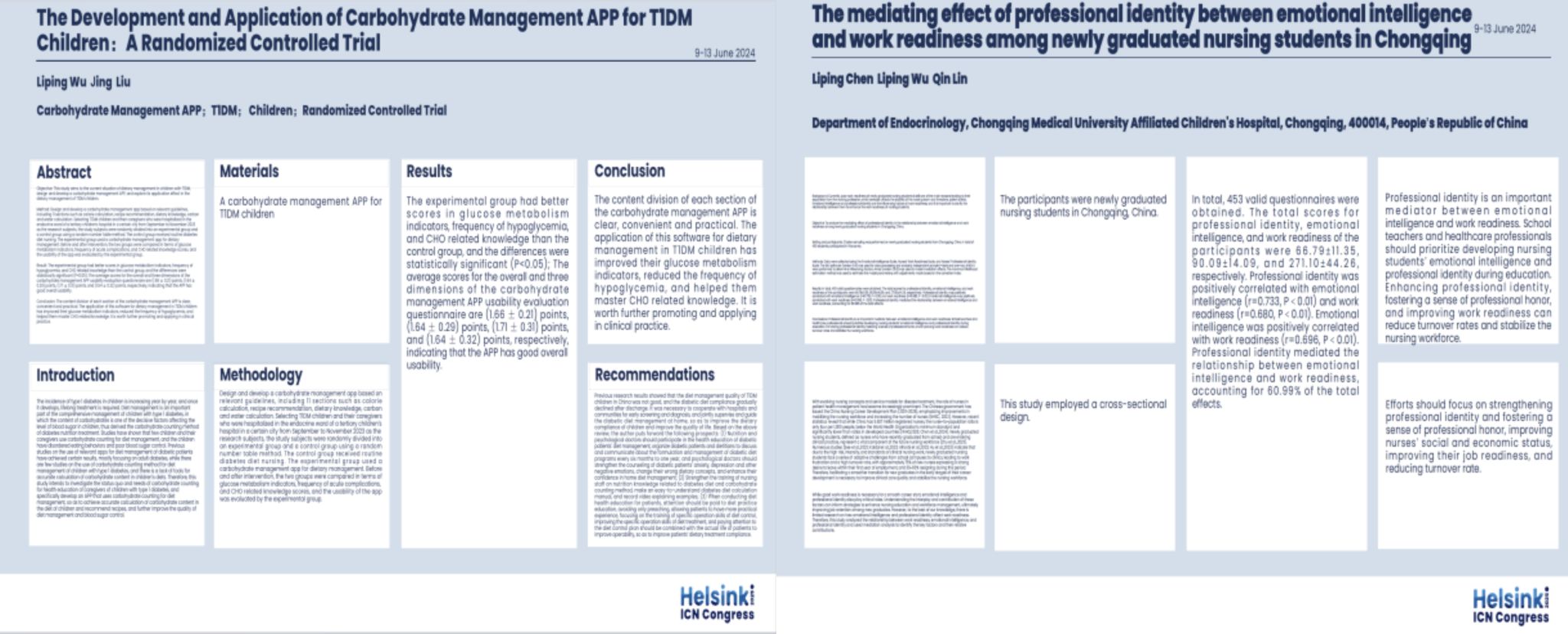 2025年6月9-13日,以“Nursing Power to Change the World(护理力量改变世界)”为主题的第30届国际护士会(ICN)大会在芬兰赫尔辛基隆重举行。本次盛会汇聚全球140余个国家、7000余名护理专业人士,共同探讨护理在促进健康公平与提升医疗质量中的核心作用。重庆医科大学附属儿童医院由护理部崔璀副主任带队,参会人员包括门诊部莫霖护士长、余璐副护士长,我院5篇学术论文进行学术交流,彰显了团队在儿童慢性病管理、专科实践创新及护士领导力提升等领域的国际化学术影响力。