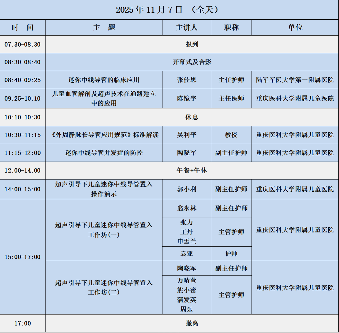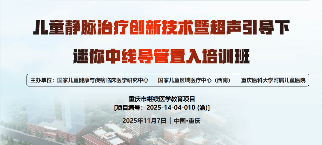 为提升儿童静脉治疗规范化水平,提升护理人员的迷你中线导管规范化应用能力,推进静脉治疗人才梯队建设,强化循证思维能力养成,推动儿科静脉治疗实践与科研创新。国家儿童健康与疾病临床医学研究中心、国家儿童区域医疗中心(西南)、重庆市儿科质控中心及重庆医科大学附属儿童医院将于2025年11月7日在重庆医科大学附属儿童医院两江院区举办“儿童静脉治疗创新技术暨超声引导下迷你中线导管置入培训班”[项目编号:2025-14-04-010 (渝)],线下参会完成学习的学员将授予重庆市Ⅱ类学分2分,欢迎各医疗机构广大护理同仁踊跃参加。