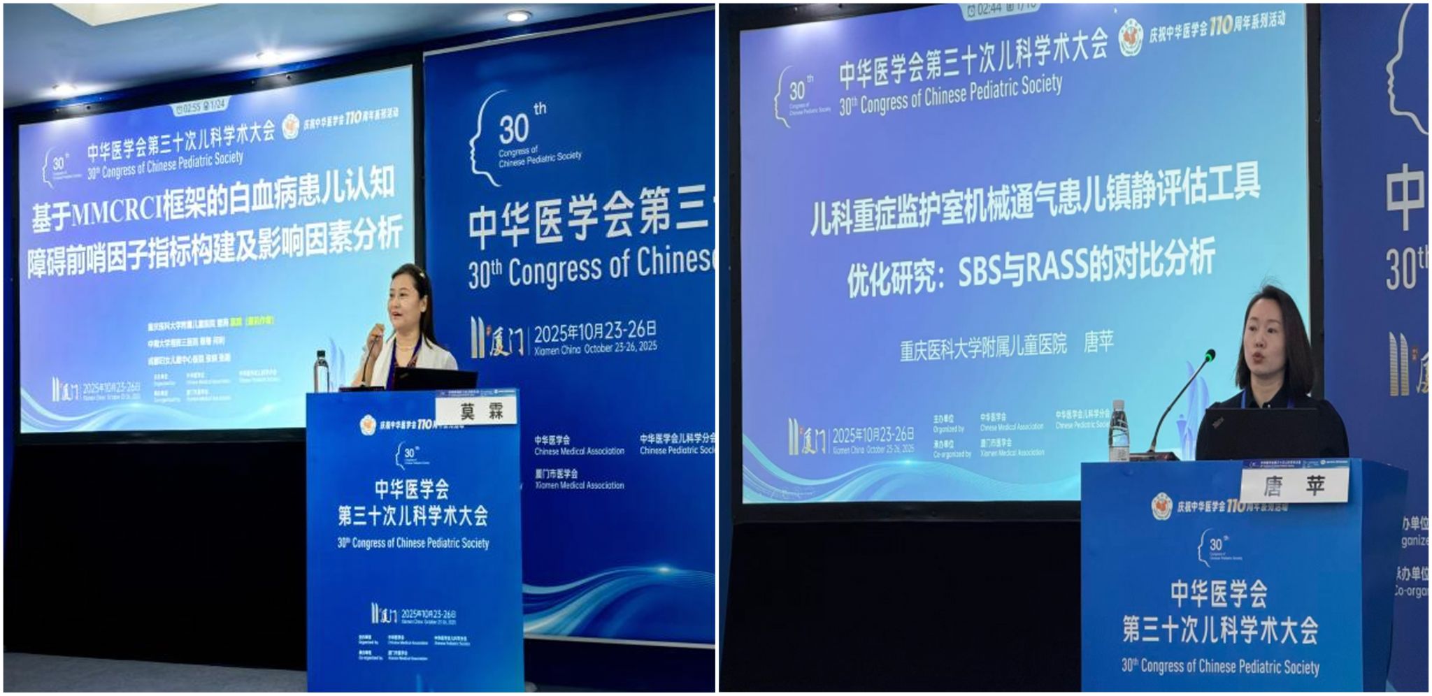 门诊护士长莫霖以《基于MMCRCI框架的白血病患儿认知障碍前哨因子指标构建及影响因素分析》,唐苹以《儿科重症监护室机械通气患儿镇静评估工具优化研究:SBS与RASS的对比分析》做了大会快闪发言。莫霖护士长基于国家自然科学基金研究的阶段性成果得到会场各位专家高度赞扬和认可。
