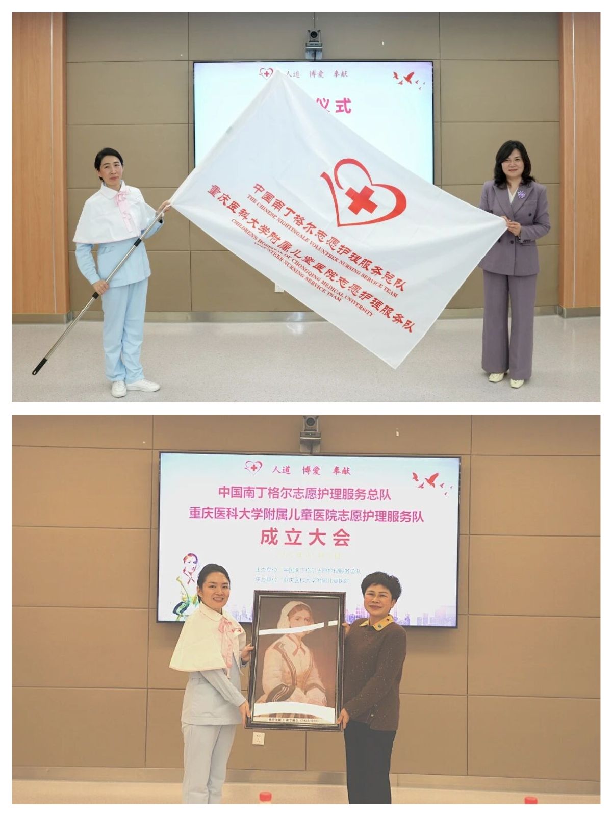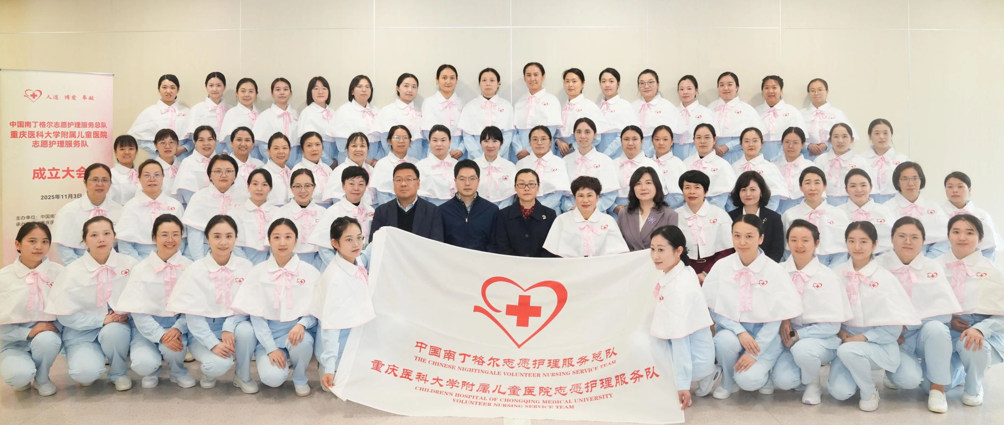 2025年11月3日,在中国南丁格尔志愿护理服务总队、重庆市红十字会及重庆市卫生健康委员会的共同指导与见证下,中国南丁格尔志愿护理服务总队重庆医科大学附属儿童医院志愿护理服务队庄严成立,编号为总队的第1140支志愿护理服务队。中国南丁格尔志愿护理服务总队副秘书长陶莲德、重庆市红十字会宣传部部长秦红梅、重庆市卫生健康委员会医政医管处处长代茂利、重庆医科大学附属儿童医院院长华子瑜、党委副书记刘湘、副院长王佚、南丁格尔奖获得者甘秀妮及医院护士代表共同出席成立大会。