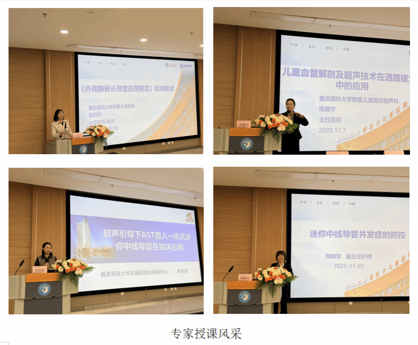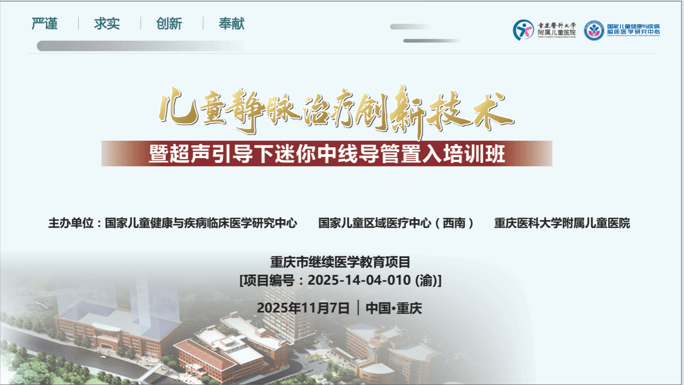 为推动创新技术在儿科静疗领域的规范化应用,2025年11月7日,由我院主办的重庆市继续医学教育项目[2025-14-04-010(渝)]“儿童静脉治疗创新技术暨超声引导下迷你中线导管置入培训班”在重医儿院两江院区顺利举行。培训班吸引了来自全国 12 个省市自治区的200余名静疗护理骨干齐聚一堂,共同探索儿童静脉通路建立的精准化解决方案。