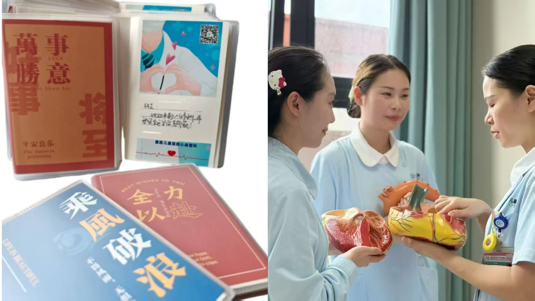 一枚小小的、针脚稚拙的发圈,系着孩子纯真的心意,也承载着规培护士的职业认同。护培护士胡芝回想起刚入重医儿童医院,心血管科护士长张琴在赠予的笔记本扉页上,亲笔写下的殷切期许,字字如星火。规培护士们执此灯火,在病房的方寸之地默默耕耘——她们治愈孩子,也被童真治愈;她们传递勇气,也被信任重塑。那些稚嫩笔迹写下的名字,终将成为岁月里最珍贵的勋章,见证着护理事业恒久的温度。