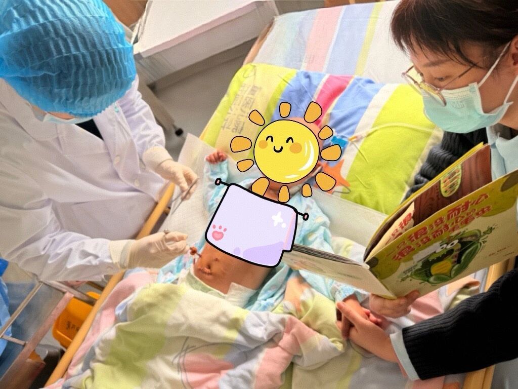 坚持在场:我们及时出现在孩子需要我们的时刻,温和问候,持续床边阅读,及时肯定他的每一个微小变化。在他最恐惧的换药时刻,我们总在他视线之内,用平稳语速讲述故事,轻轻握住他冰凉小手,将其注意力从疼痛引向绘本画面与情节。