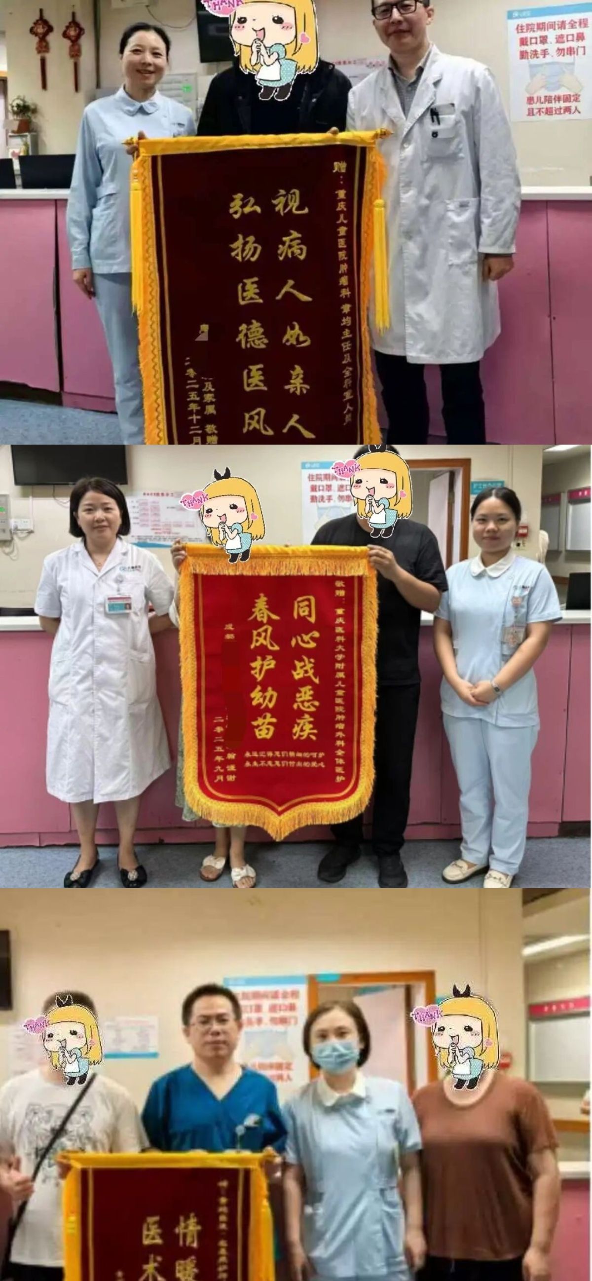 一面面锦旗,静静挂在科室的墙上,无声地诉说着一个个关于爱与希望的故事。“情暖人心,技术精湛”。“同心战恶疾,春雨护幼苗”……每一句感谢的背后,都是医护团队与患儿家庭并肩作战的见证。