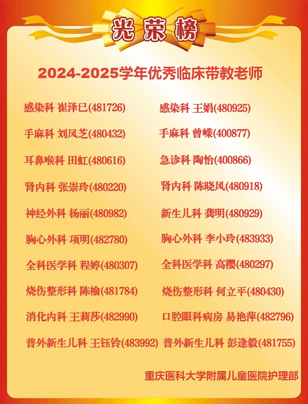 为夯实临床护理教学根基,激发临床带教活力,我院完成了2024-2025学年临床护理优秀带教老师评选工作。经过严格遴选、综合考评,20名护理师资凭借扎实的专业素养、精湛的教学能力和赤诚的育人情怀,获评 “优秀临床护理带教老师” 称号。在此,向所有获奖老师致以最热烈的祝贺!