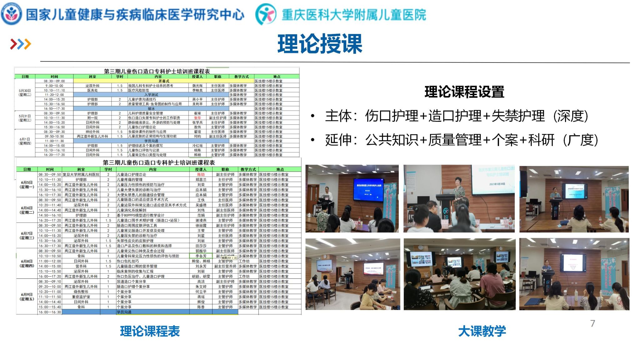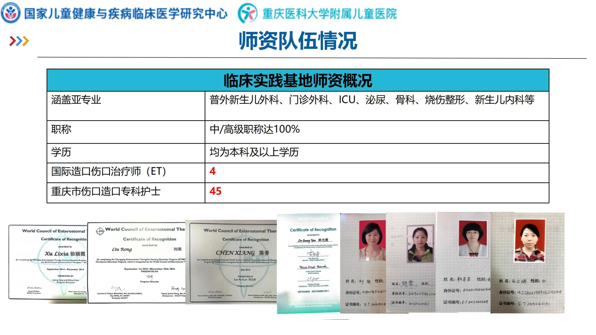 重庆医科大学附属儿童医院在2021年经重庆市卫生健康委员会批准为儿童伤口造口专科护士培训基地,2023年获批国际造口治疗师学校(ET)临床教学基地,目前是全国仅有的一家儿童伤口造口专科护士培训双基地单位,我院拥有一批专业的儿童伤口造口失禁培训师资,其中包括ET(国际造口师)4名,国际伤口治疗师1名,伤口造口专科护士40余名,覆盖率了普外新生儿、门诊外科、骨科、泌尿外科、ICU、烧伤、新生儿、风湿免疫等多个亚专业。基地有丰富的教学经验,采用理论教学,模拟教学训练联合临床观摩及临床实践相结合的教学模式。基地各专业开展“以家庭为中心的肠造口全程管理”、“新生儿疑难伤口处理”、“小儿伤口负压治疗”、“小儿烧烫伤”、“小儿皮肤感染”等多个特色小儿造口、伤口护理项目,每年承担院内外儿科护理会诊2000余例次,明显提高了小儿造口、伤口护理质量,缩短了患儿的平均住院日,减轻了家庭经济负担,提升了患儿照护者对护理工作的满意度,取得了良好的社会效益。